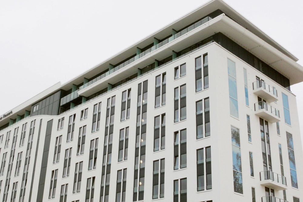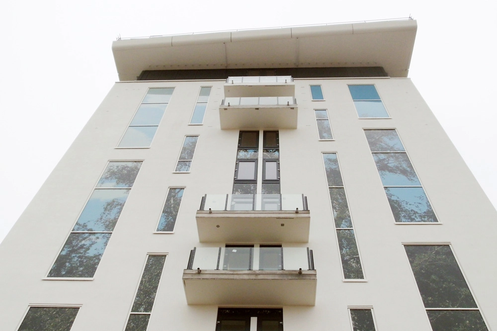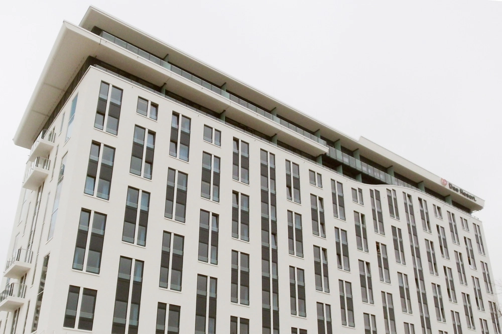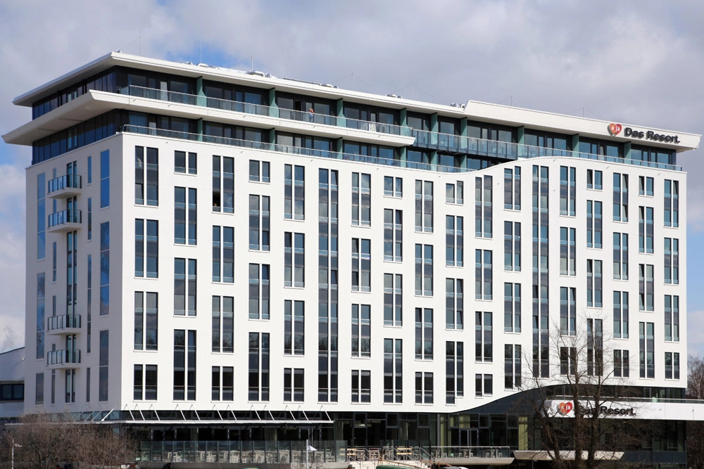 Im Jahr 2012-2013 realisierten wir für STRABAG, Niederlassung Hamburg, in Warnemünde das Hotel aja mit Fenstern, Glasgeländern und Fensterfassaden im 10. und 11. OG. Für die schmalen Glasgeländer-Konstruktionen waren zu diesem Zeitpunkt noch Zulassungen im Einzelfall (ZiE) erforderlich, die wir im Zuge des Auftrages mit ausführten.