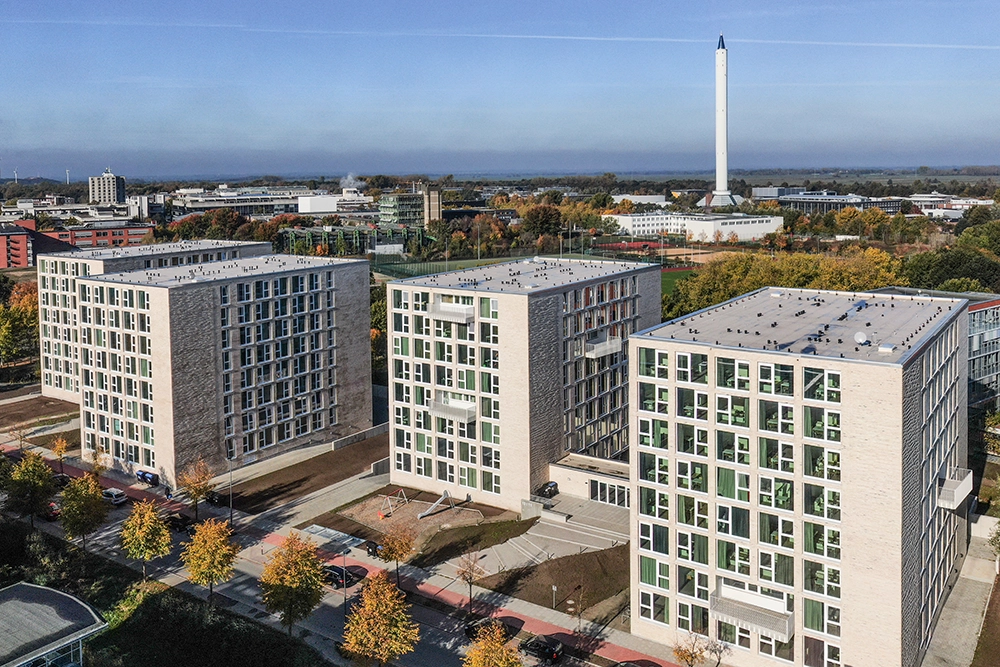 Unweit der UNI Bremen entstanden 2017/2018 vier Gebäude mit Mikro Apartments. Hierfür führten wir die absturzsichernden Schallschutz-Fensterelemente inkl. der Belüftungsanlagen für die Firma Kamü Bau GmbH aus.