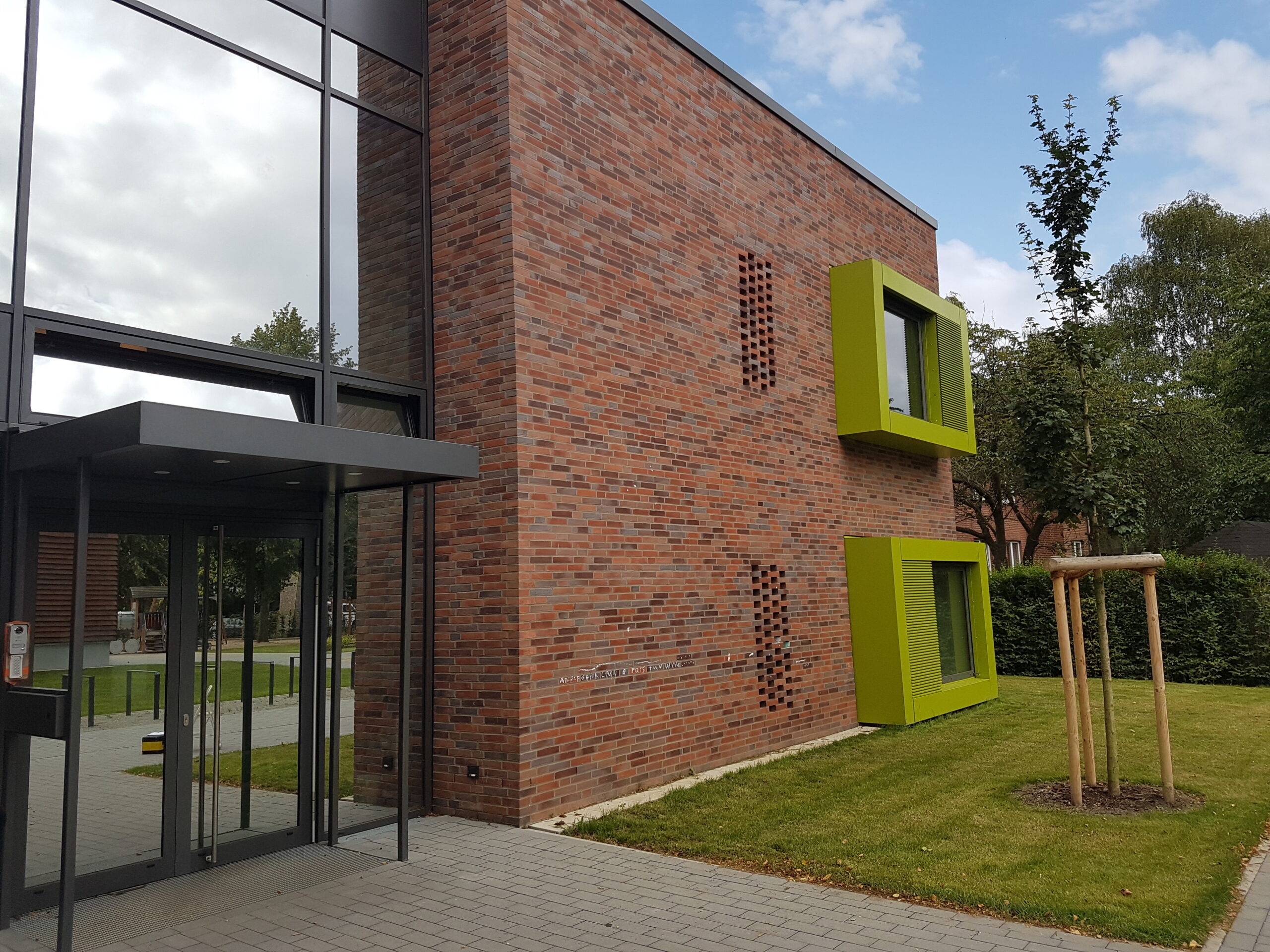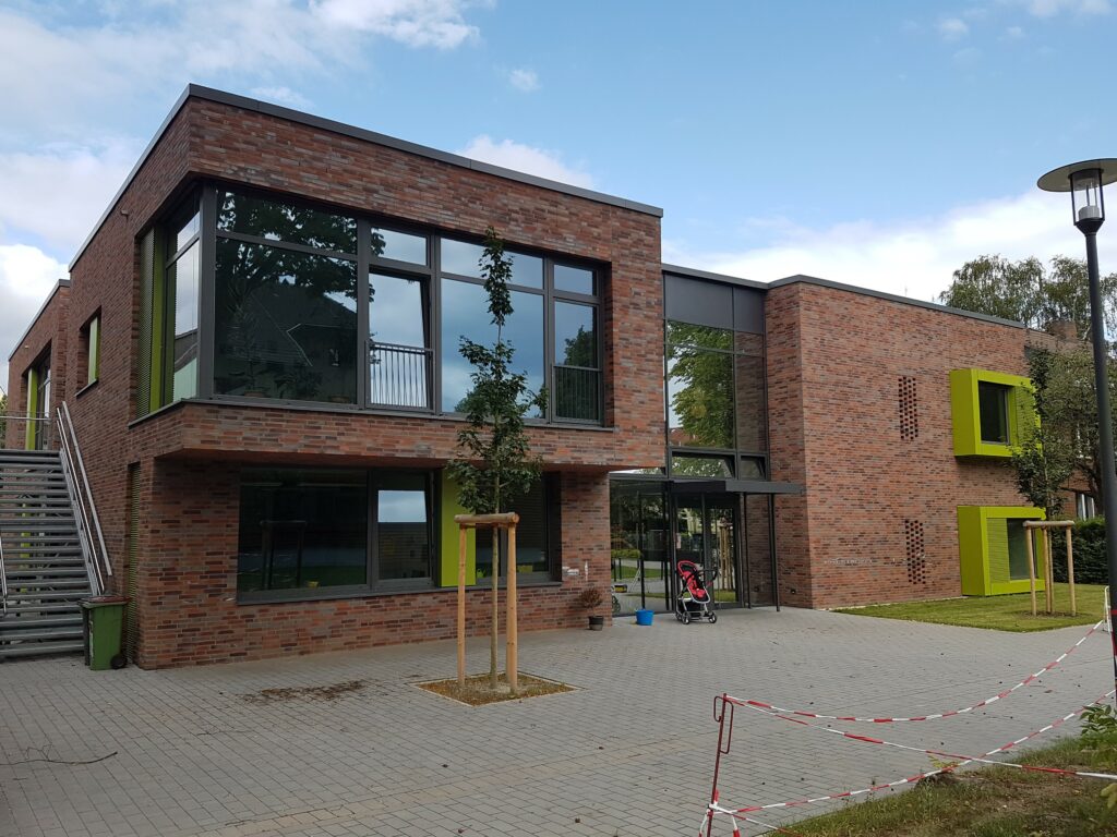Im Auftrag der Altus Bau GmbH wurde der Neubau Kita und Gemeindehaus in Hamburg durchgeführt. Die Fensterelemente mit großflächigen Festverglasungen sind absturzsichernd und die Flügel bodentief mit Kipp-vor-Dreh-Beschlag und vorgelagerten Geländern ausgeführt. Die Fenster ermöglichen durch vorgelagerte RC2 Lüftungsgitter eine Nachtauskühlung im Sommer. Weiterhin wird diese Variante durch Aufsatzlüftungselemente verbessert.